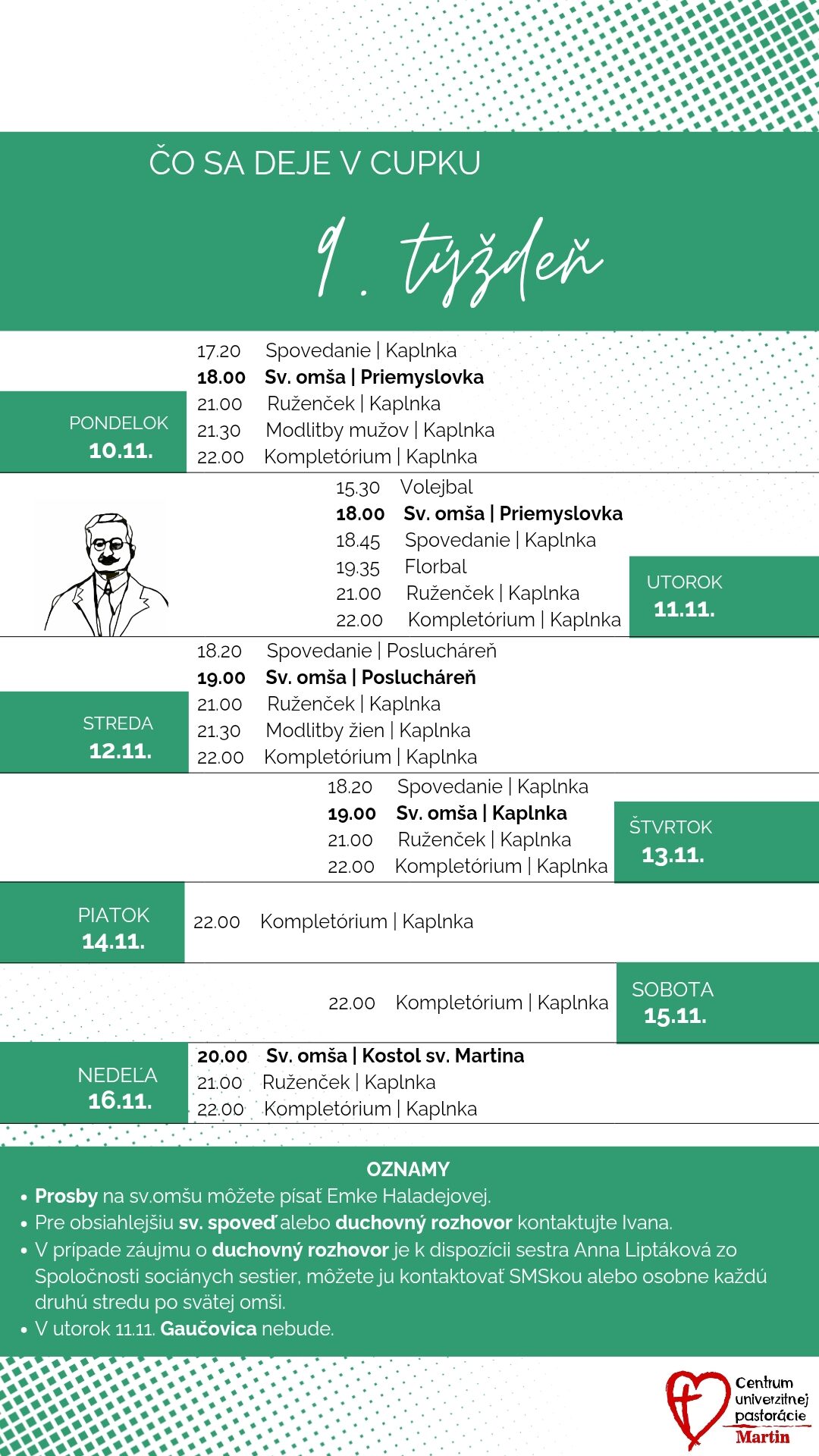 Sme Centrum Univerzitnej Pastorácie (CUP) pri Jesseniovej lekárskej fakulte UK v Martine. Študujeme medicínske odbory a spája nás viera v Boha. Spoločne trávime čas na svätých omšiach, duchovných, športových a zdravotníckych akciách či výletoch. Našou víziou je duchovný a osobnostný rozvoj, cesta bližšie k Bohu a služba pacientom s láskou. CUP je našou druhou rodinou – priestorom na rast, priateľstvá a využitie talentov. Máme otvorené dvere pre každého, kto túži po spoločenstve, modlitbe, hudbe, čaji či športe. Pridaj sa k nám!